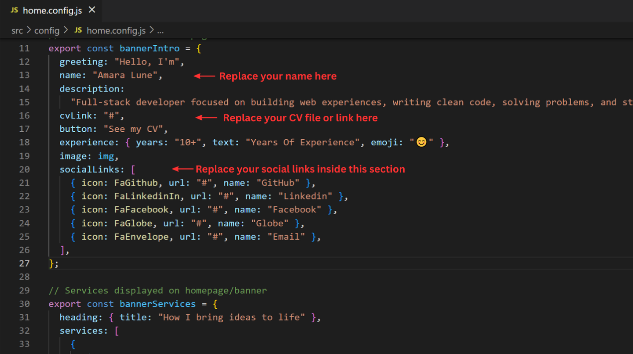 Clear comments show you exactly where to replace your own data.